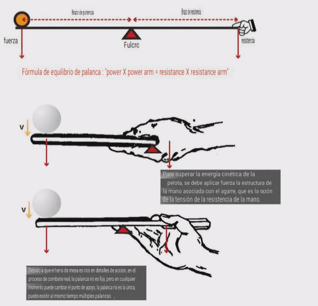 La biomecánica del agarre y el golpe en el tenis de mesa es dinámica, ya que el punto de apoyo cambia según la necesidad de absorción o generación de fuerza.